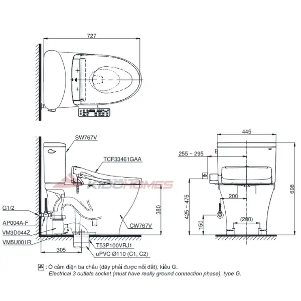 Bản vẽ kỹ thuật của bàn cầu 2 khối TOTO CS767RW24#XW kèm WASHLET S2
