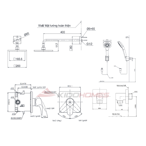 Bản vẽ kỹ thuật của bộ sen tắm âm tường TOTO TBG04304BA/TBN01001B/TBW02013B/TBW08001A/TBW2005V