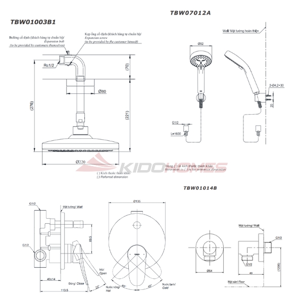 Bản vẽ kỹ thuật của bộ sen tắm âm tường TOTO TBS04304B/TBW01014/TBW01003B1A/TBW07012A